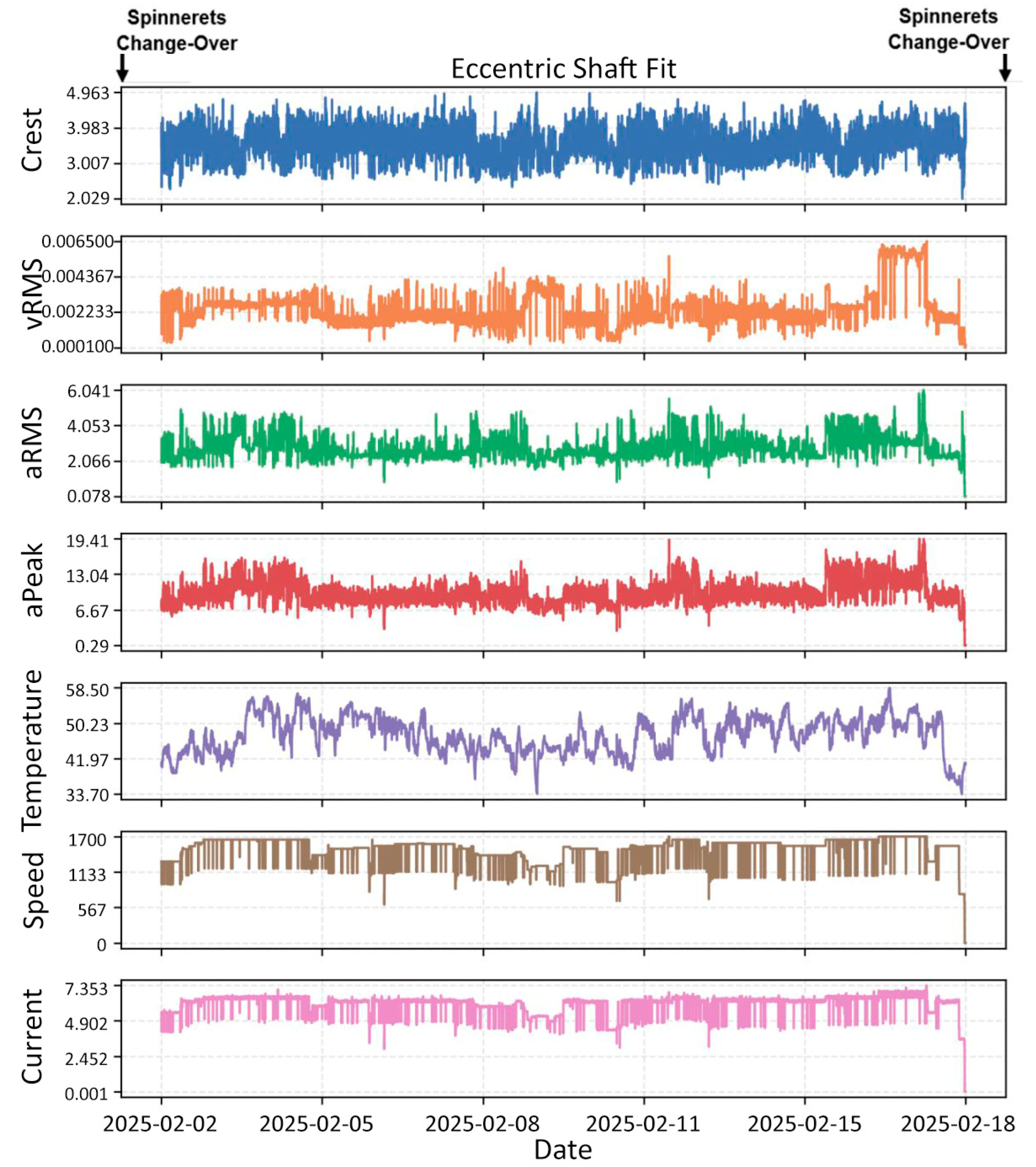 - Motor Current (Amps) was included as a final complementary feature reflecting the electromechanical interaction within the system. Mechanical faults such as imbalance, shaft misalignment, or bearing degradation often lead to increased or unstable current draw. Including current as a feature enables early detection of faults that impact torque or load characteristics and improves fault separability in conjunction with vibration-based features.