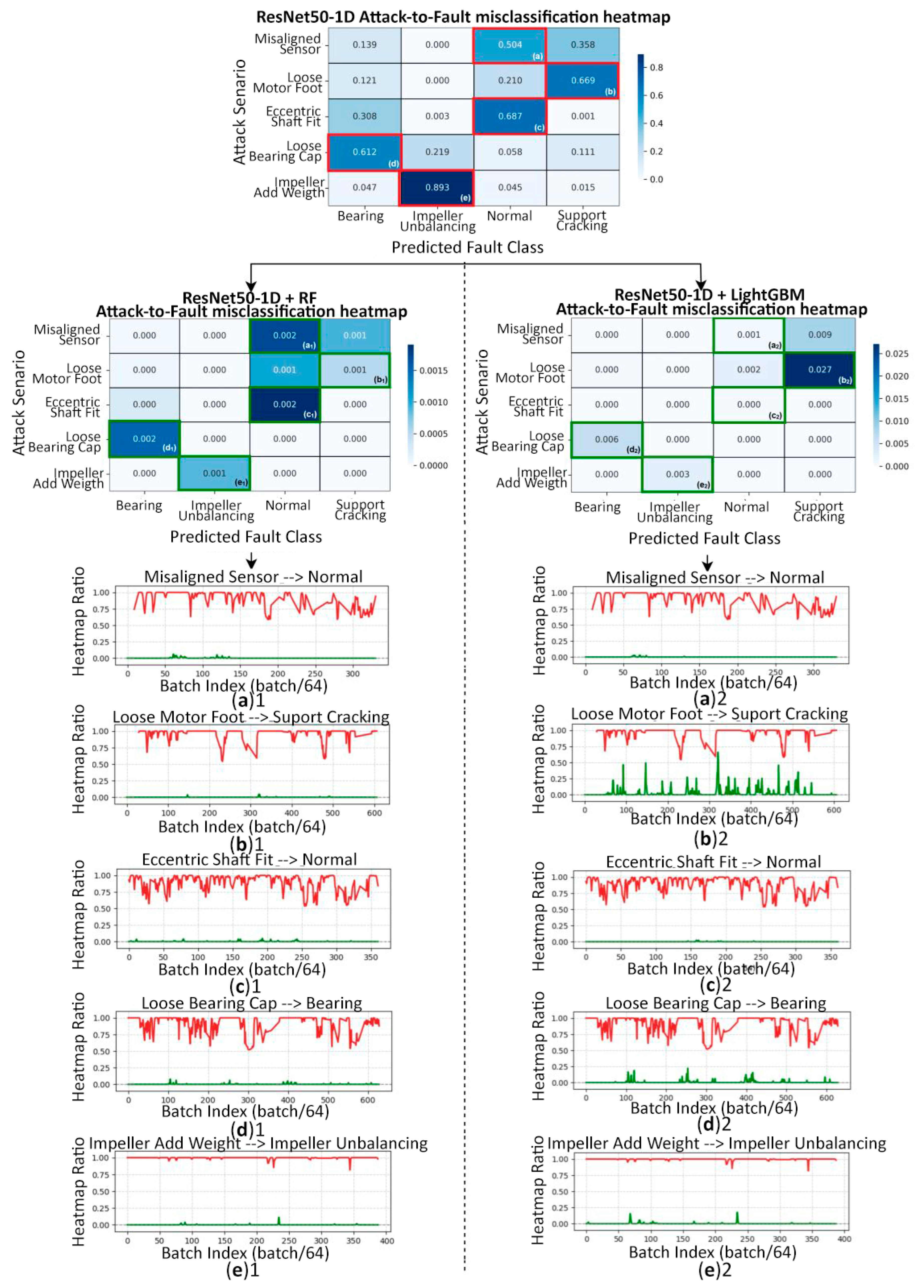 | [33] | Developed a Time–Frequency Network that improves noise robustness and interpretability in bearing FD. | TFN addresses stochastic disturbances, whereas the present study focuses on systematic adversarial perturbations in industrial machinery, offering complementary insights. |