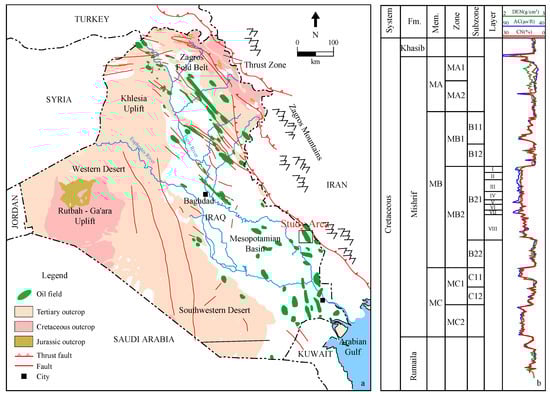 - Aqrawi, A.A.M.; Thehni, G.A.; Sherwani, G.H.; Kareem, B.M.A. Mid-Cretaceous rudist-bearing carbonates of the Mishrif Formation: An important reservoir sequence in the Mesopotamian basin, Iraq. J. Pet. Geol. 1998, 21, 57–82. [Google Scholar] [CrossRef]