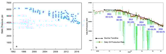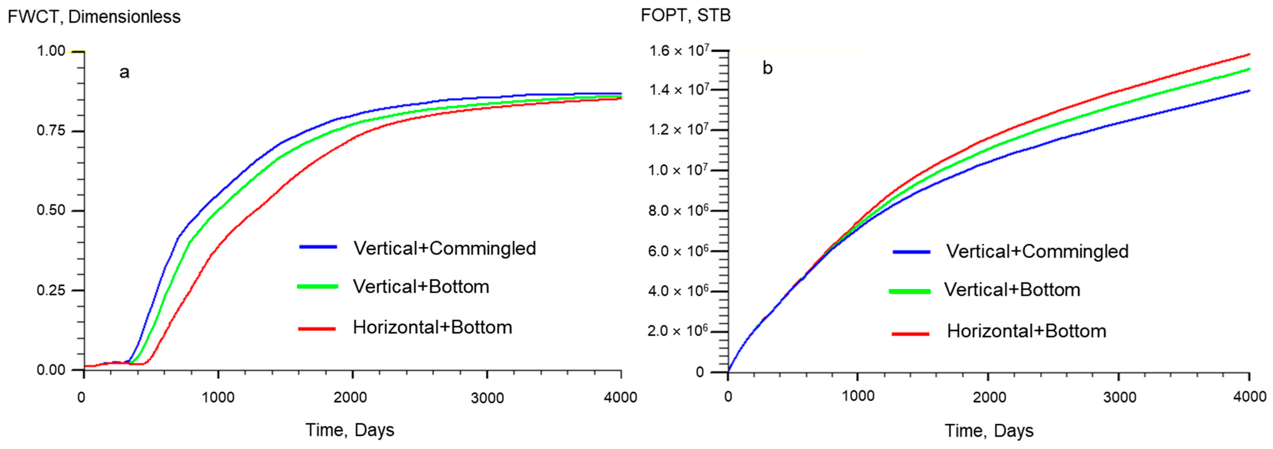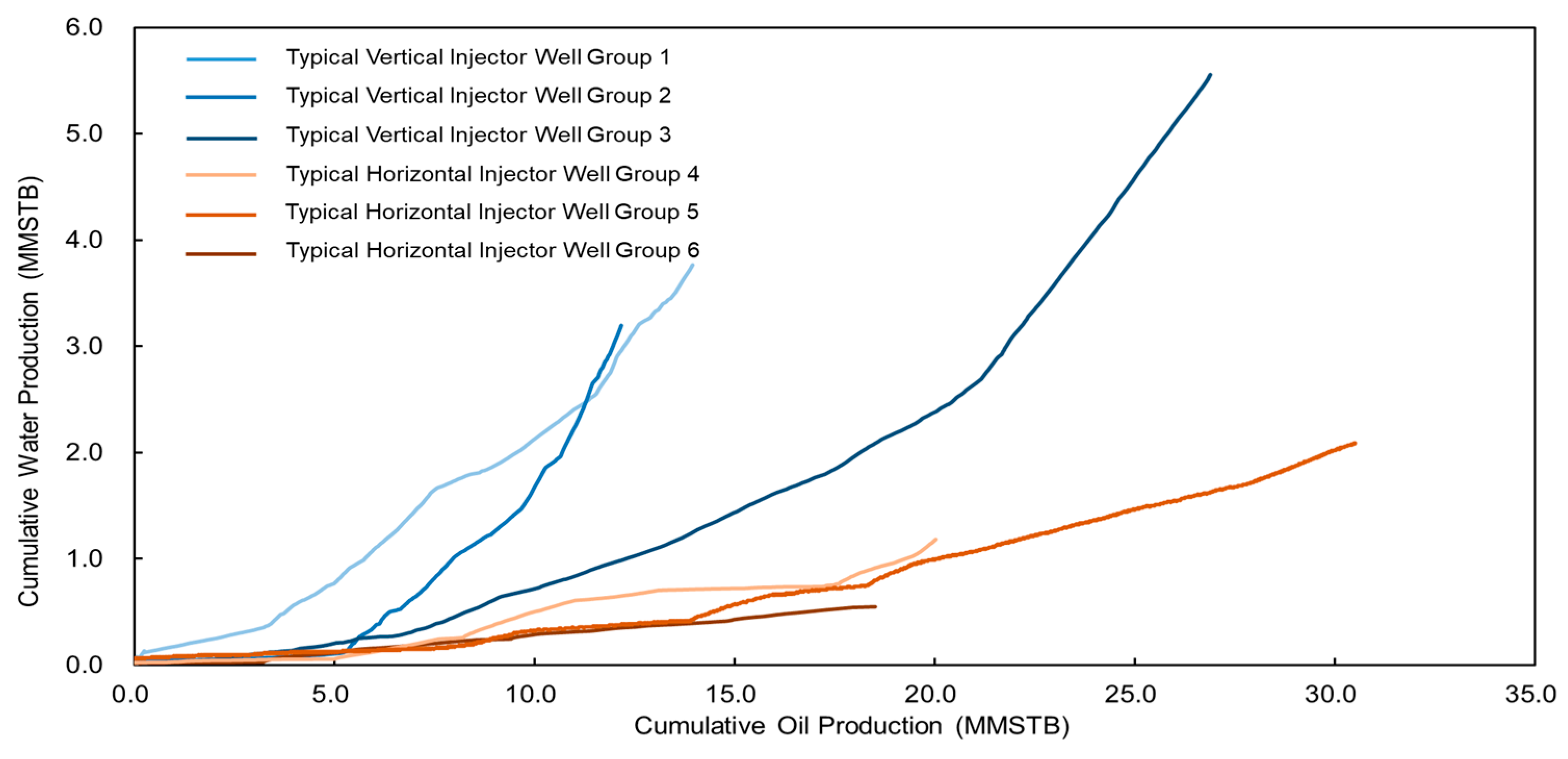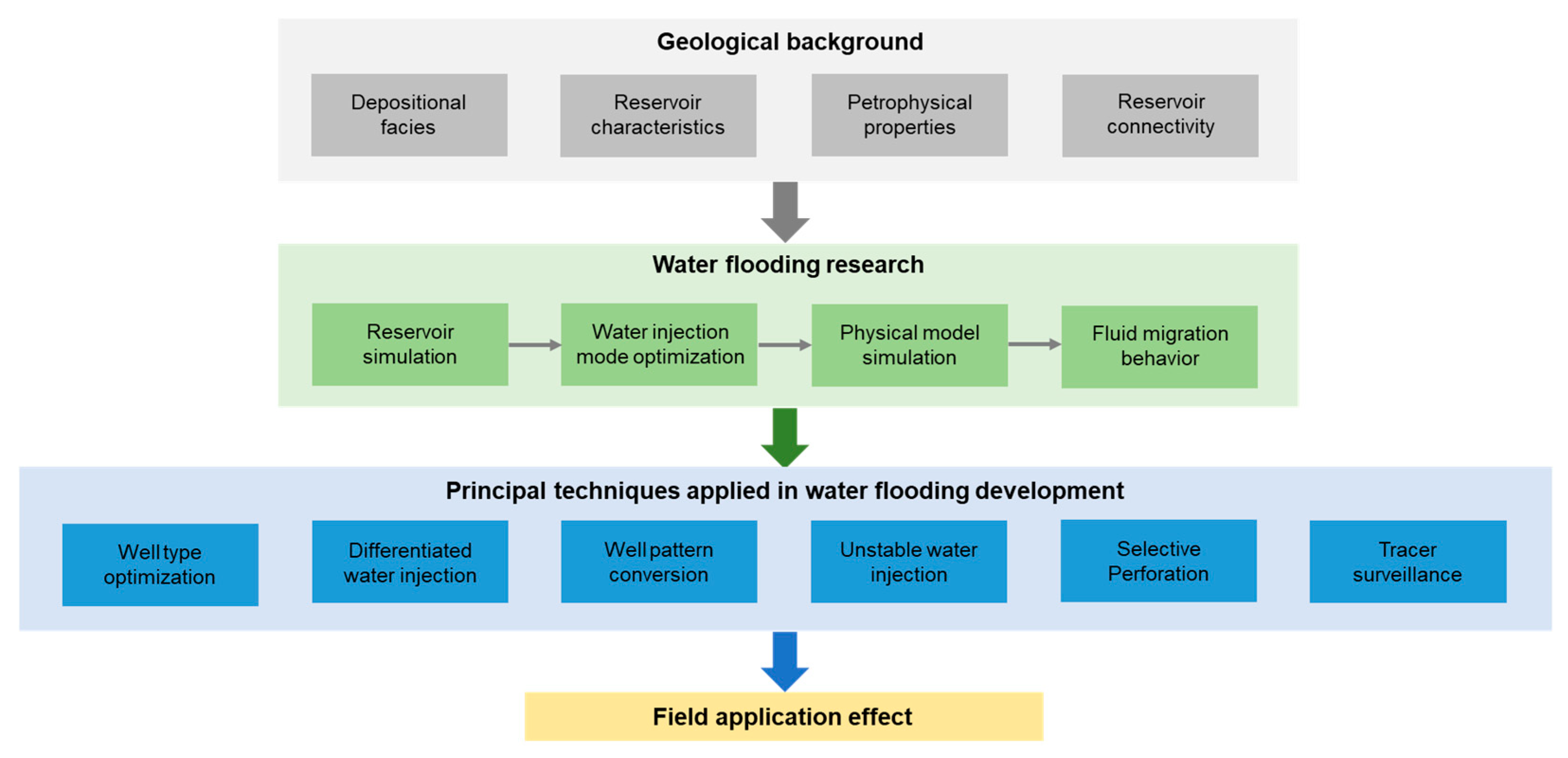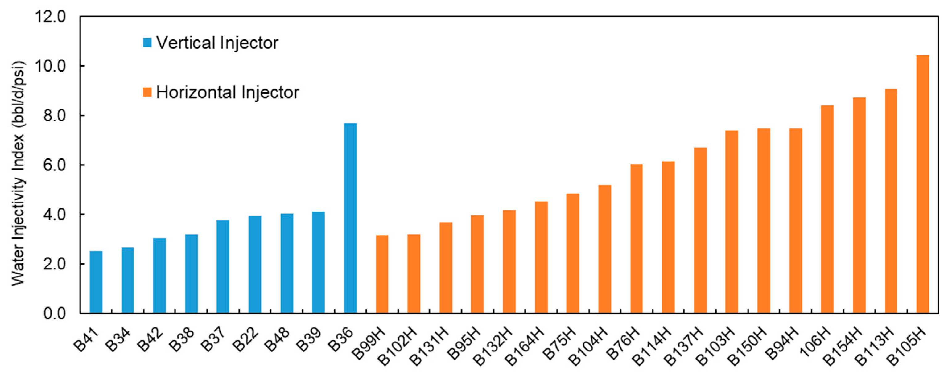 - As the contract mode of the B Oilfield belongs to the TSC (Technical Service Contract) framework, the CAPEX and OPEX paid by operators in advance will be fully recovered by the governments of countries with resources [47]. The final benefits for a contractor are equal to the product of the remuneration fee per barrel and increased oil production beyond the base production set in the contract, and the profits of contractors are mainly affected by the reached PPT (production plateau target) and the length of the stable production period. Hence, this paper mainly concentrates on the technical success results from a series of development technologies instead of economic enhancement. However, in other contract modes, economic evaluation is also necessary to comprehensively demonstrate the enhancements led by water flooding technologies.