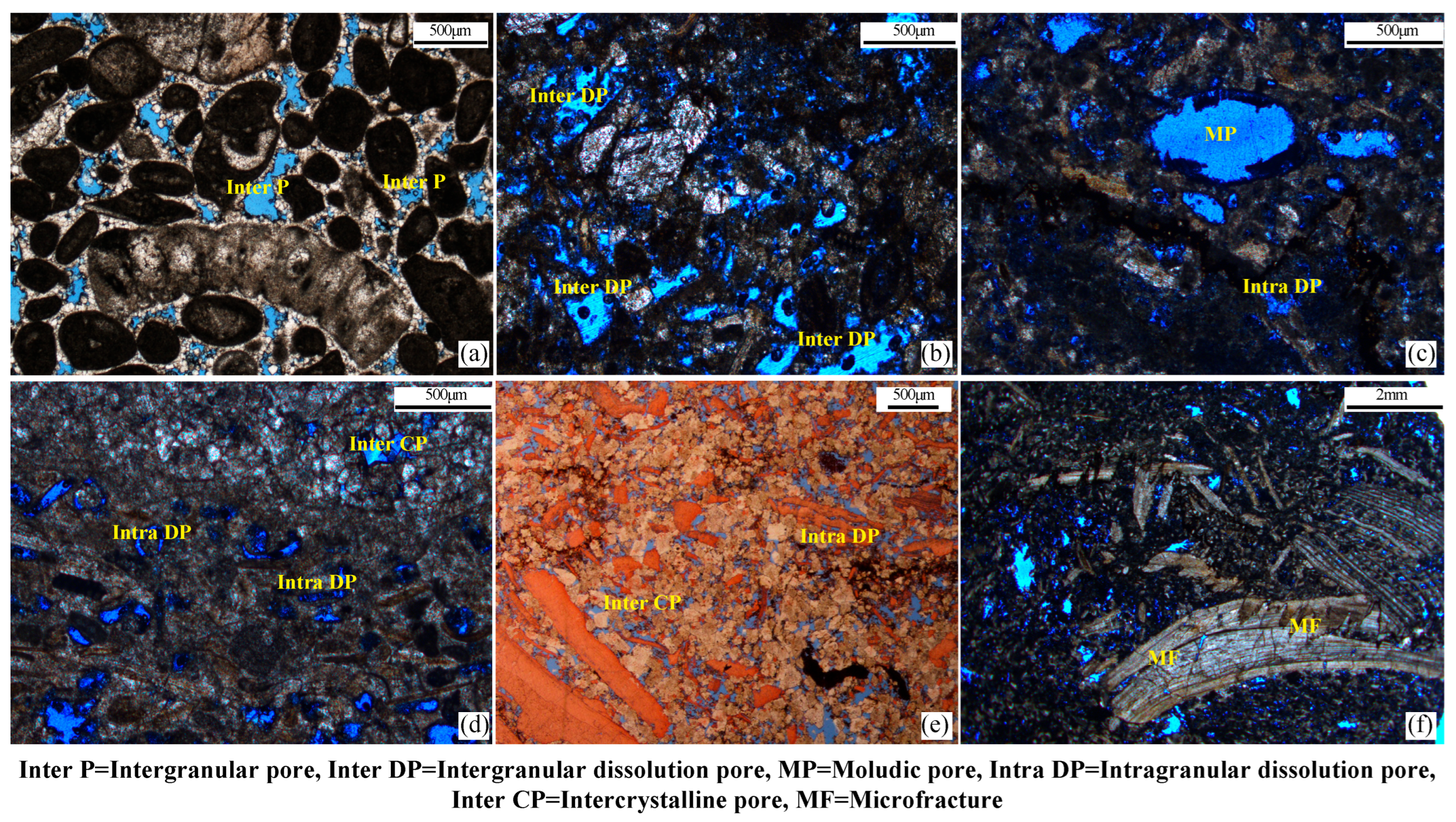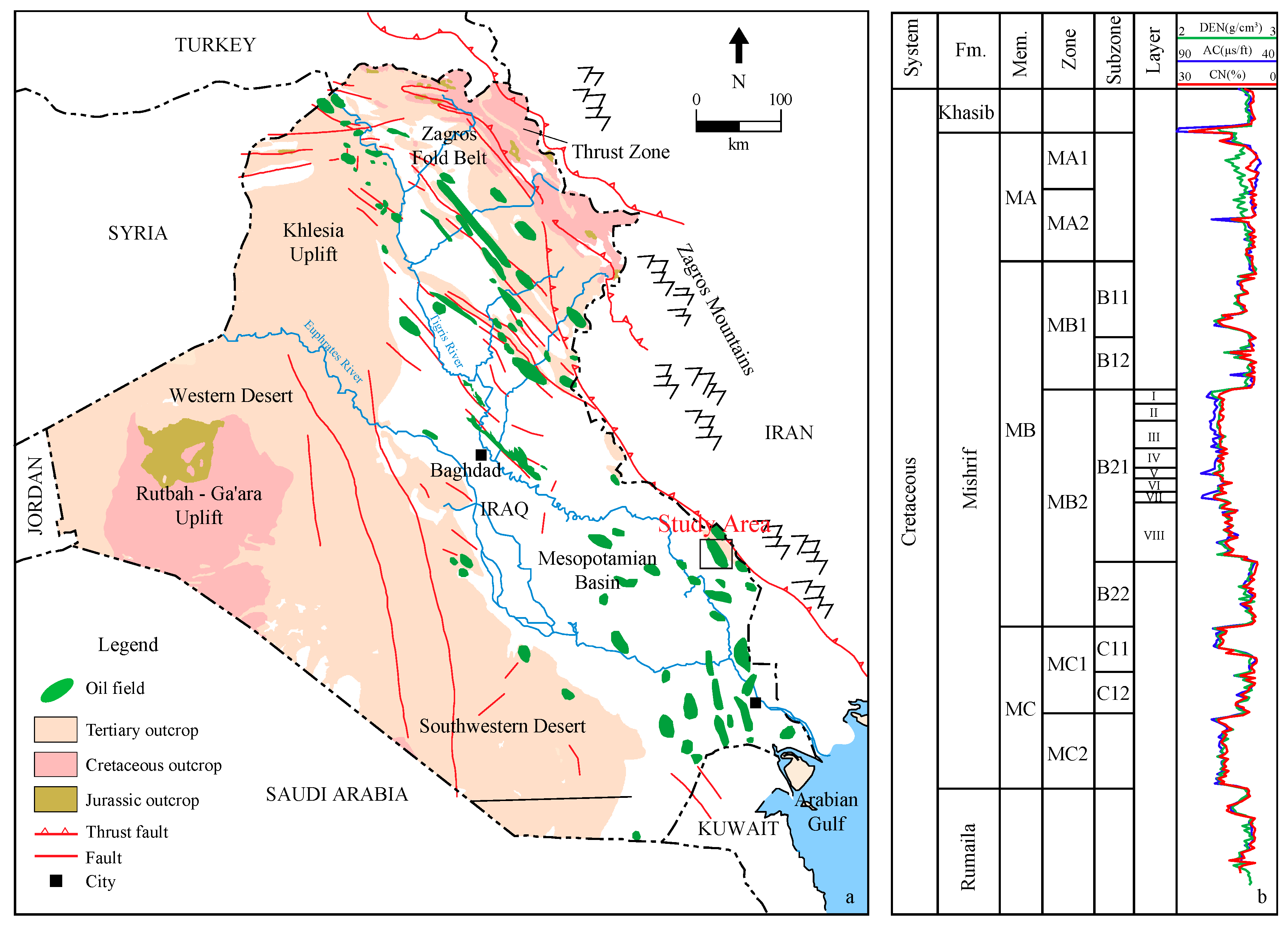 - Zhao, L.M.; Zhou, W.; Zhong, Y.; Guo, R.; Jin, Z.; Chen, Y. Control factors of reservoir oil-bearing difference of Cretaceous Mishrif Formation in the H oilfield, Iraq. Petrol. Explor. Dev. 2019, 46, 314–323. [Google Scholar] [CrossRef]