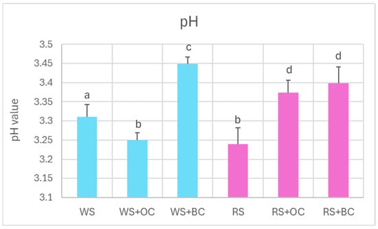 pH of white and red sauerkraut. WS, white sauerkraut; WS+OC, white sauerkraut with orange carrots; WS+BC, white sauerkraut with black carrots; RS, red sauerkraut; RS+OC, red sauerkraut with orange carrots; RS+BC, red sauerkraut with black carrots. Pale blue, white cabbage; purple, red cabbage. Different letters indicate statistically significant differences (p < 0.05). One-way ANOVA with post hoc Tukey test.