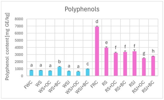 Polyphenol content of white and red cabbage, fermented cabbage (sauerkraut), and sauerkraut juice. FWC, fresh white cabbage; WS, white sauerkraut; WS+OC, white sauerkraut with orange carrots; WS+BC, white sauerkraut with black carrots; WSJ, white sauerkraut juice; WSJ+OC, juice of white sauerkraut with orange carrots; WSJ+BC, juice of white sauerkraut with black carrots; FRC, fresh red cabbage; RS, red sauerkraut; RS+OC, red sauerkraut with orange carrots; RS+BC, red sauerkraut with black carrots; RSJ, red sauerkraut juice; RSJ+OC, juice of red sauerkraut with orange carrots; RSJ+BC, juice of red sauerkraut with black carrots. Pale blue, white cabbage; purple, red cabbage. Different letters indicate statistically significant differences (p < 0.05). One-way ANOVA with post hoc Tukey test.