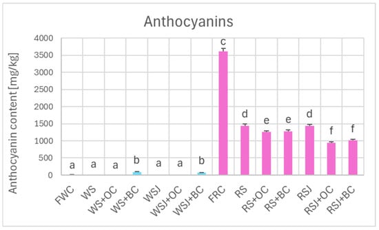 Comparison of the antioxidant properties of fresh and fermented cabbage demonstrated that the fermented cabbage retained most of the polyphenols (Figure 2) and, in the case of red cabbage, anthocyanins (Figure 3). In white cabbage, the total polyphenol content did not differ significantly between fresh cabbage and sauerkraut (821 ± 10 vs. 798 ± 9 mg/kg). In contrast, red sauerkraut had significantly less polyphenols than fresh red cabbage (3990 ± 100 vs. 6915 ± 99 mg/kg). The juice contained comparable amounts of polyphenols and anthocyanins as the solid sauerkraut. The addition of black carrots increased the polyphenol content in the white sauerkraut (up to 1291 ± 57 mg/kg) and white sauerkraut juice (from 689 ± 10 to 1001 ± 19 mg/kg). In contrast, the addition of orange or black carrots decreased the content of anthocyanins and polyphenols in the red sauerkraut (down to 3245 ± 113 and 3387 ± 127 mg/kg, respectively) and red sauerkraut juice (from 3467 ± 204 to 2484 ± 78 and 2777 ± 31 mg/kg, respectively).