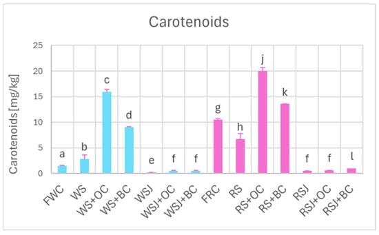 The addition of carrots enriched the sauerkraut in carotenoids—the effect being more significant for orange carrots. The carotenoid concentration did not increase significantly in the sauerkraut juice (Figure 4), apparently due to the hydrophobicity of these compounds and practical insolubility in aqueous solutions.