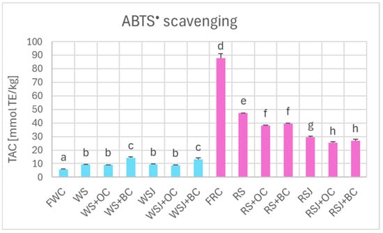 The TAC of fresh and fermented white and red cabbage estimated by the ABTS• scavenging assay. Pale blue, white cabbage; purple, red cabbage. Different letters indicate statistically significant differences (p < 0.05). One-way ANOVA with post hoc Tukey test.
