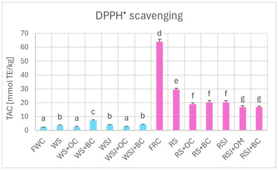 The TAC of fresh and fermented white and red cabbage estimated by the DPPH• scavenging assay. Pale blue, white cabbage; purple, red cabbage. Different letters indicate statistically significant differences (p < 0.05). One-way ANOVA with post hoc Tukey test.