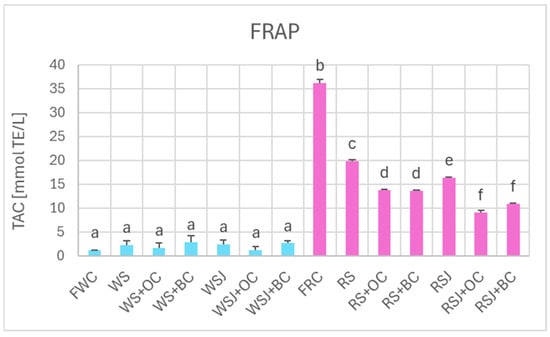 The TAC of fresh and fermented white and red cabbage estimated by FRAP. Pale blue, white cabbage; purple, red cabbage. Different letters indicate statistically significant differences (p < 0.05). One-way ANOVA with post hoc Tukey test.