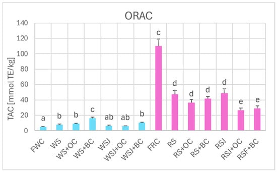 The TAC of fresh and fermented white and red cabbage estimated by ORAC. Pale blue, white cabbage; purple, red cabbage. Different letters indicate statistically significant differences (p < 0.05). One-way ANOVA with post hoc Tukey test.