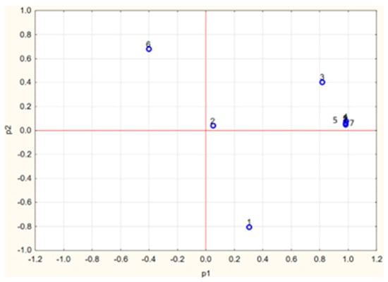Charge plot of the parameters used for the description of cabbage antioxidant properties. 1, polyphenol content; 2, anthocyanin content; 3, carotenoid content; 4, TAC-ABTS•; 5, TAC-DPPH•; 6, TAC-FRAP; 7, TAC-ORAC.