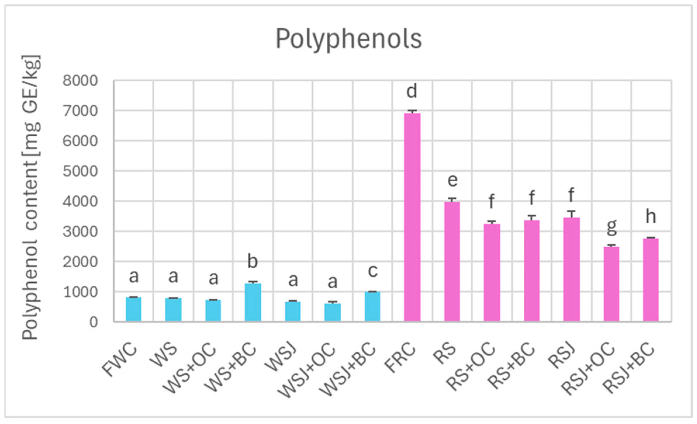 Polyphenol content [mg GAE/kg] | 821 ± 10 | 6915 ± 91 |