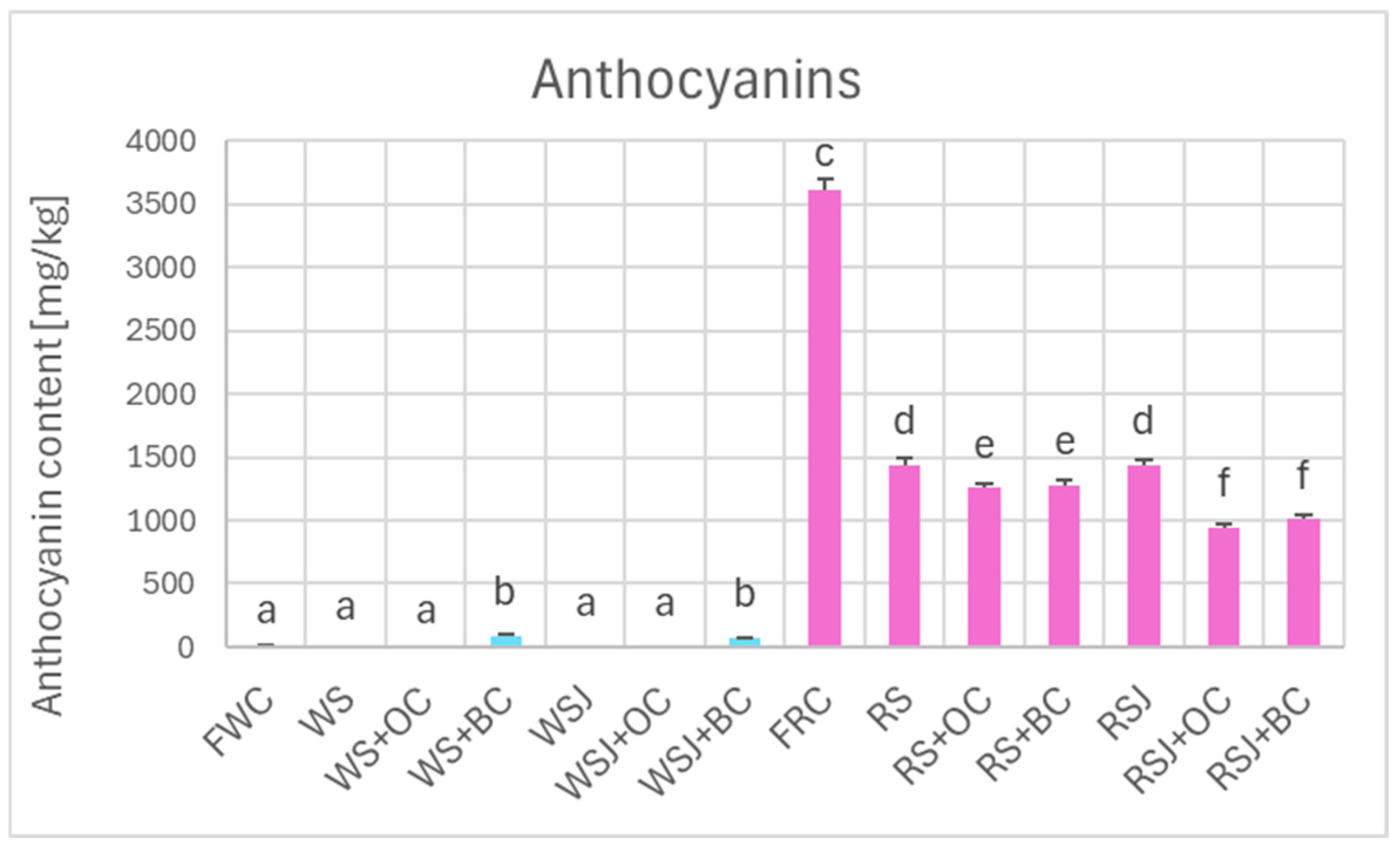Anthocyanin content [mg/kg] | 6.3 ± 2.5 | 3610 ± 93 |