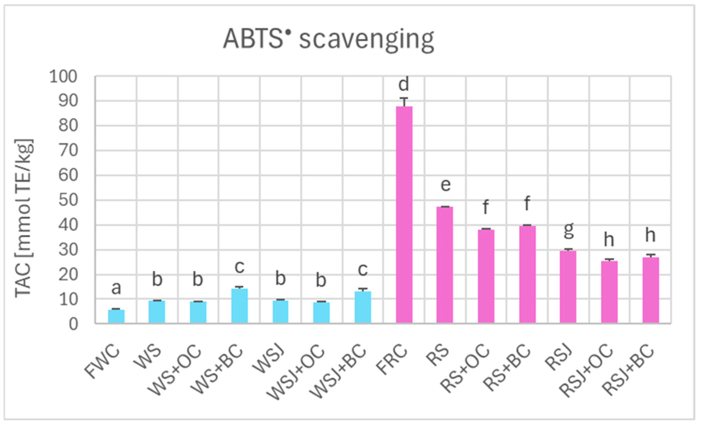 TAC, ABTS• decolorization [mmol TE/kg] | 5.8 ± 0.2 | 87.9 ± 3.3 |