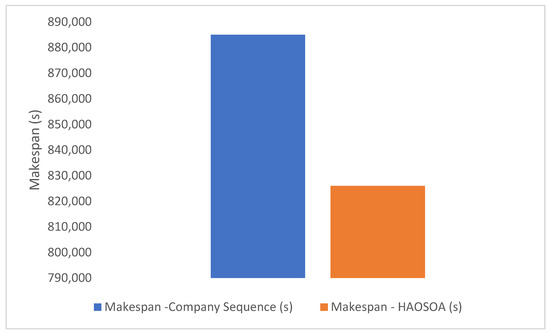 The scheduling problem of a leading electrical panel board manufacturing industry located in Chennai, India, is considered in this work. The industry produces various models of panel boards. Among them, Model-X is used in this work. The panel board model-X consists of 20 different parts. The parts are processed in seven different stages. The different stages and the number of machines in each stage are presented in Table 1. The processing time of jobs on different machines is given in Table 2. The company accepts orders and processes them. The company simply follows the first-in-first-out dispatching rule. The panel boards are manufactured in lots. The lot size is 300. The company completes the production of one lot in 885,000 s. After implementing the HAOSOA, the completion time has significantly reduced. The comparison of the makespan for the company sequence and the sequence attained by the HAOSOA is depicted in Figure 2. From the figure, it is evident that the proposed HAOSOA has significantly reduced the makespan. The makespan value of about 6% has been reduced by implementing the HAOSOA. The makespan reduction would reduce the production cost as well as the power consumption. A reduction in power consumption will reduce the environmental impacts caused by industry. Random problems were also used to validate the performance of the proposed HAOSOA. Computational experiments on random problem instances are discussed in the following section.