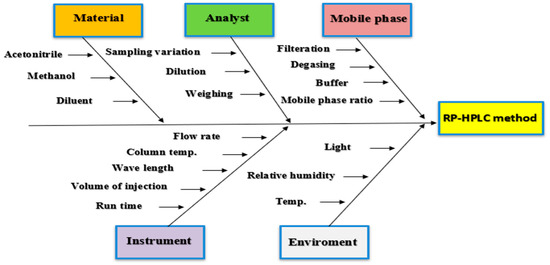 The study aimed to identify the potential risk parameters of CMPs. The method performance parameters were identified based on the preliminary experiments and prior knowledge of HPLC development studies. Initially, the critical risk parameters were identified. All possible factors that influence method outcomes and method development were evaluated. These parameters were systematically varied to assess their impact on performance attributes, such as retention time, peak asymmetry, and resolution. To visualize the relationship between risk parameters and performance attributes, a fishbone diagram was constructed [31,35]. Subsequently, each risk parameter was assessed based on severity, occurrence, and detectability concerning method performance. The risk priority number (RPN) method was employed to quantify risk potency. The RPN was determined by multiplying the values of severity, occurrence, and detectability assigned for each risk parameter. Finally, the RPN scores were plotted against the method performance to classify risk into low, medium, and high-risk levels [31,36].