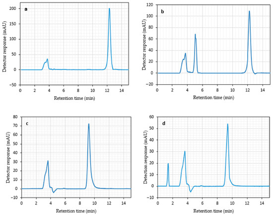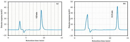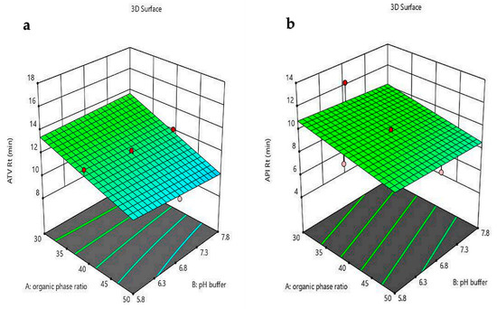 According to the literature, methanol and acetonitrile are the most used organic solvents in HPLC quantification methods for ATV and API individually, with C18 columns also frequently employed [55,56]. Considering the physicochemical properties of the analytes, it is evident that API is more hydrophilic than ATV. As a result, API is eluted faster than ATV due to its weaker interaction with the nonpolar stationary phase of the C18 column. Based on these characteristics, the initial mobile phase composition was set at a 50:50 (v/v) ratio of organic to aqueous phase, which achieved a clear separation of both compounds. However, when the organic phase proportion was increased beyond 50% (v/v), separation deteriorated, as demonstrated in Figure 5. Consequently, it was decided to maintain the organic phase ratio within the range of 30–50% (v/v). Further enhancement of peak shape and symmetry was achieved by adjusting the pH, with preliminary trials indicating that good resolution was obtained within the pH range of 5.8 to 7.8 using glacial acetic acid and ammonium hydroxide (0.1 M) for adjusting the pH.