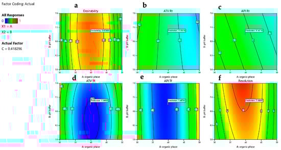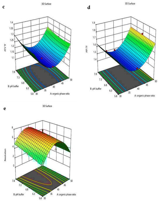 A Critical Quality Attribute (CQA) is defined, in accordance with ICH Q9, as a physical, chemical, biological, or microbiological property or characteristic that must be maintained within a specified limit, range, or distribution to ensure the intended quality of the product [41]. These CQAs are crucial for ensuring the reliability and robustness of chromatographic methods. The retention time ensures consistent and reproducible elution of analytes, critical for accurate identification. The tailing factor reflects peak symmetry, which has a direct impact on peak integration and quantification accuracy, where values close to 1 indicate ideal symmetrical peaks. Resolution represents the degree of separation between adjacent peaks, preventing overlap and ensuring the specificity of the method. Thus, the selected CQAs for this study were tailing factor (Tf), retention time (Rt), and resolution (Rs) [33,35,37].