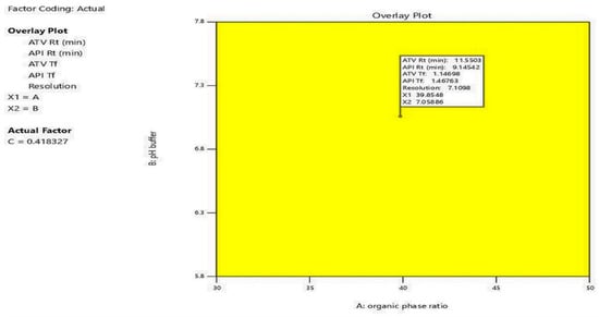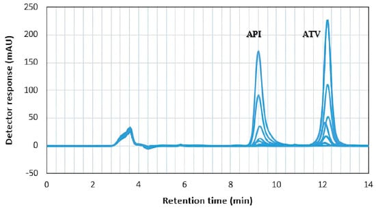 For wavelength detection, both ATV and API were prepared in 100 µg mL−1 solution and scanned by UV spectrophotometry (PerkinElmer SP-UV 300 from PerkinElmer, Waltham, MA, USA) in an overlaid spectrum at 400–200 nm range and selecting the optimum common wavelength.
