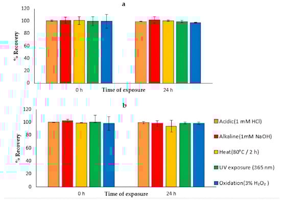 However, the oxidation resulted in significant degradation (p < 0.05) of 12% degradation after 24 h, and this is attributed to the presence of a hydroxyl group on the B-ring, which makes it prone to oxidation to form phenoxyl derivatives [71]. A related study showed 65% of API was degraded in 3% H2O2 over 24 h [70], a much higher value likely resulting from a stronger oxidizing condition and undiluted stress agent, as opposed to our diluted setup. The alkaline stress exposure showed a significant degradation (p < 0.05) of about 14% after 24 h of exposure time, which might be attributed to the solubility profile of API in basic solvent. Another study showed that API underwent 46% degradation when exposed to 1 N NaOH over 24 h [70], further emphasizing the impact of stress agent concentration and preparation method. Photodegradation was notably significant (p < 0.05), as depicted in (Figure 12c,d) with around 30% reduction observed after 24 h (p < 0.01), which is aligning closely with a study that reported 30.2% degradation under UV exposure and another study that observed 20% degradation due to sunlight after just 2 h [5,64].