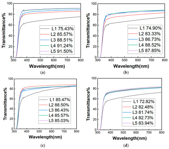 Figure 2d shows the transmittance curve of the GO/SiO2-coated samples after salt spray corrosion. It can be seen that the transmittance of all samples has decreased. This is because, compared with acid and alkali corrosion, the corrosion of the GO/SiO2-coated samples by salt spray test is partly due to the diffusion of Cl−, water molecules and H+ within the film layer and the damage [19] to the glass substrate and interface. On the other hand, corrosion was due to the deposition [20] of salt particles on the surface, and the deposition of salt particles had a greater impact on the permeability, resulting in a decrease in the permeability of all samples during the test period. But the permeability of sample L1 decreased by 2.61%, and that of sample L5 decreased by 7.56%, proving that graphene oxide films can improve salt spray corrosion resistance.