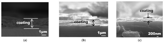 A cross-sectional SEM image is shown in Figure 4. Figure 4a shows sample L1 at a spin-coating rate of 2500 r/min. It can be seen from the figure that the cross-sectional structure of the film layer is clear, the film layer is uniform and complete, and the thickness is approximately 2.1 μm. Figure 4b shows sample L2, with a spin-coating rate of 3500 r/min. It can be seen that the cross-section of the film layer is clear and intact, the film layer is tightly bonded to the sample substrate and the film layer thickness is approximately 1 μm. After the spin-coating rate is increased by 1000 r/min, the thickness of the film layer is reduced by 1.1 μm compared to sample L1. This is because, as the spin-coating rate increases, the increased centrifugal force during spin coating would cause more GO/TEOS coating solution to be flung off the sample substrate due to centrifugal force at a higher spin-coating rate compared to a lower spin-coating rate, resulting in a decrease in film thickness. Figure 4c shows sample L3, with a spin-coating rate of 4500 r/min. It can be seen that the cross-section of the film layer is clear and closely bonded to the sample substrate, and the film layer is evenly distributed with a thickness of approximately 0.4 μm, which is 1.7 μm thinner than sample L1 and 0.6 μm thinner than sample L2. It is indicated that increasing the spin-coating rate would reduce the thickness of the film when the GO/TEOS coating solution forms the film, resulting in a thinner film layer.