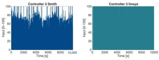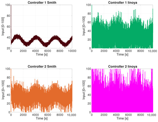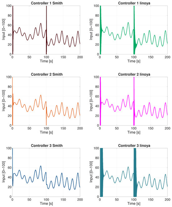 Figure 16 reveals that the noise amplification in Controller 3 using the I&A approach is so pronounced that the control signal nearly saturates continuously. This behavior makes the controller heavily reliant on small sampling intervals to maintain control effectiveness. Other controllers, except Controller 1 with the Smith Predictor, also display erratic behavior, albeit to a lesser extent. Notably, Controller 1 with the Smith approach maintains a relatively smooth control action, demonstrating its superior capability to filter out high-frequency noise that adversely affects the other control strategies.