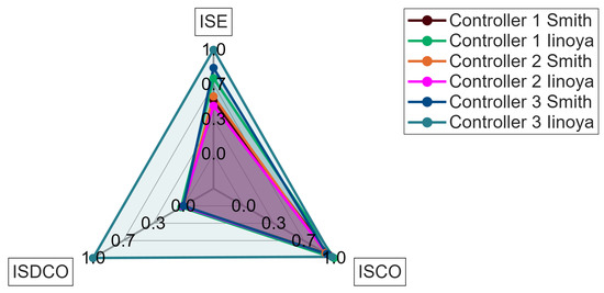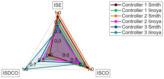 As with the CSTR system, a Spider Plot is used to compare controller performance across the three metrics (ISE, ISCO, and ISDCO). The visualization in Figure 17 highlights that each control strategy presents distinct strengths and weaknesses, reflecting inherent trade-offs between tracking accuracy, energy efficiency, and smoothness of control action. Regarding ISE, Controller 2 with the I&A approach and Controller 3 with the same method achieve the lowest tracking errors. Controller 2 also attains the lowest ISCO, indicating efficient energy usage, whereas Controller 3 records the highest ISDCO, suggesting a highly aggressive control signal that, in industrial applications, could accelerate actuator wear. Although Controller 2 with I&A does not achieve the best ISDCO (this distinction belongs to Controller 1 with the Smith Predictor, as previously observed in the control action plots), it maintains a favorable balance between low tracking error and moderate energy consumption. This balance may be advantageous in scenarios where tracking accuracy is prioritized over actuator longevity, but the trade-off should be carefully evaluated for each application.
