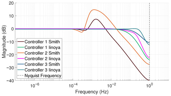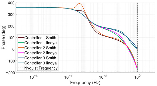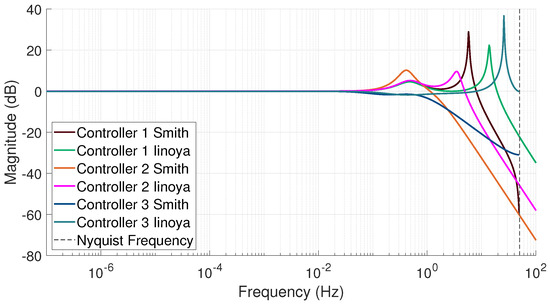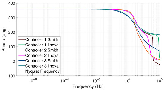 The results for both the magnitude and phase diagrams shown in Figure 18 and Figure 19 were obtained using the discrete controller designs. In both plots, the magnitude and phase responses are displayed only up to a vertical dotted line, which represents the Nyquist frequency. This frequency corresponds to half the sampling rate of the discrete system and defines the maximum frequency that can be accurately described without introducing aliasing. Beyond this point, frequency components cannot be correctly interpreted. They may lead to distortions in the system’s response, making it essential to limit the analysis to frequencies below the Nyquist limit.