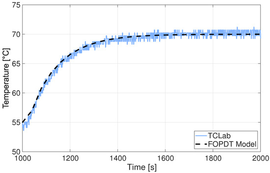 It is noteworthy that the TCLab system lacks a cooling mechanism, which causes that the temperature drop in the real system is slower than the model. Nonetheless, Figure 14 shows that the model is able to replicate the dynamics of the modified real system with a minimal error that does not affect the controller performance.