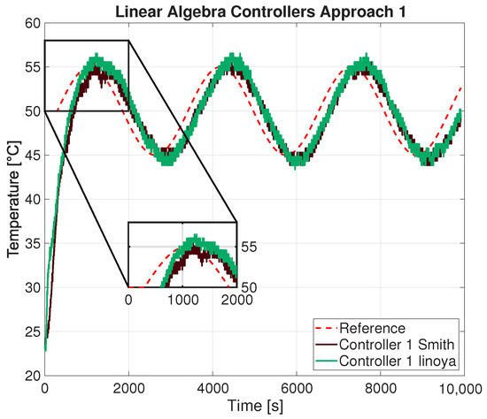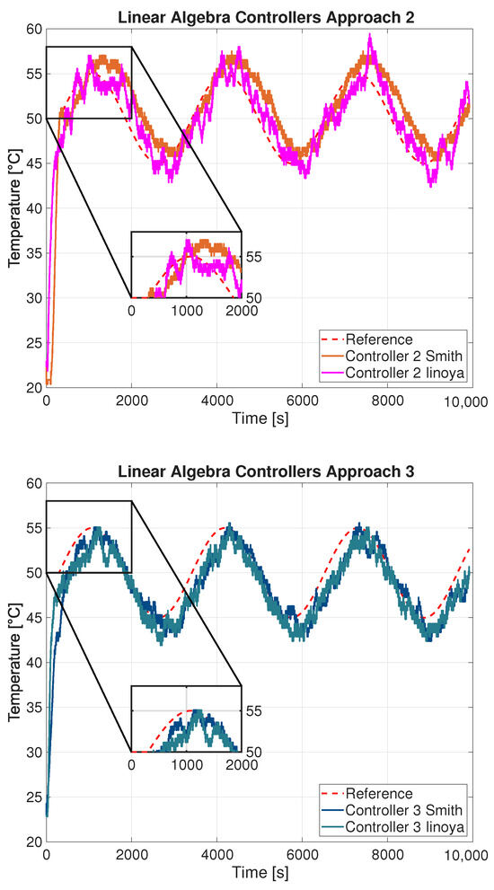 Figure 15 presents the response of the TCLab under the six control strategies for the reference trajectory defined in (73) with the gains presented in Table 3.