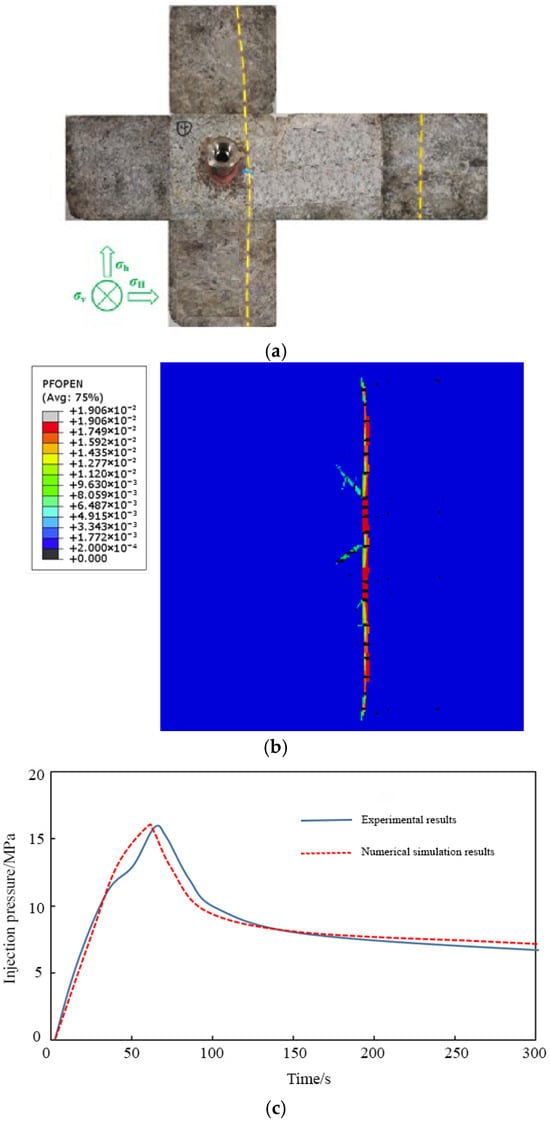 Deep shale hydraulic fracturing model verification. (a) Results of true triaxial hydraulic fracturing experiment on deep shale. (b) Numerical simulation results of true triaxial hydraulic fracturing of deep shale. (c) Comparison of injection pressure between experimental results and numerical simulation results.