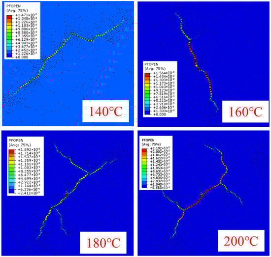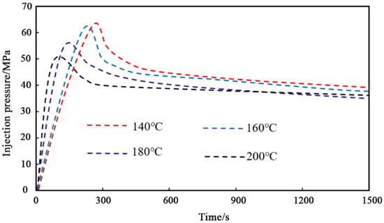 To further investigate the characteristics of hydraulic fracturing under varying formation temperatures, four injection pressure curves corresponding to different temperatures were extracted (Figure 3). By comparing the injection pressure variations, it was observed that as the formation temperature increased, the onset time of rock damage during hydraulic fracturing was significantly advanced. Specifically, rock damage occurred at approximately 320 s when the temperature was 140 °C, advanced to 296 s at 160 °C, further advanced to 261 s at 180 °C, and reached 148 s at 200 °C.