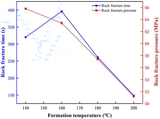 By comparing the fracture pressure and fracture extension pressure at different formation temperatures, it was found that when the formation temperature was 140 °C, the reservoir rock fracture pressure was 65.8 MPa, and the average fracture extension pressure was 47.2 MPa. At 160 °C, the fracture pressure decreased to 63.4 MPa, and the average extension pressure was 45.7 MPa. When the temperature rose to 180 °C, the fracture pressure further declined to 57.4 MPa, with an average extension pressure of 43.1 MPa. At 200 °C, the fracture pressure dropped to 51.2 MPa, and the average extension pressure was 41.1 MPa [27,28]. These results demonstrated that both fracture pressure and fracture extension pressure decreased to varying degrees as the formation temperature increased, with a significant reduction observed at 180 °C. Using a commonly employed reservoir rock fracture pressure calculation formula, the theoretical fracture pressure under these conditions was approximately 66.4 MPa. The measured fracture pressures at 140 °C and 160 °C were close to this theoretical value, whereas a marked decline occurred at 180 °C.