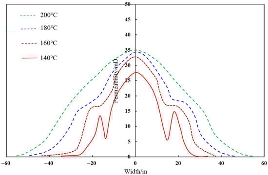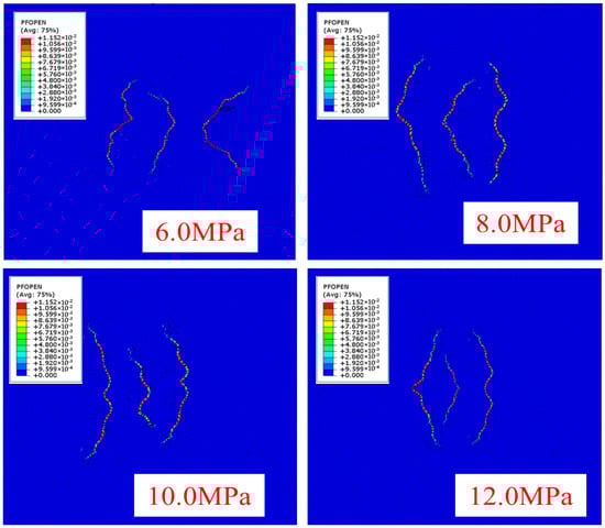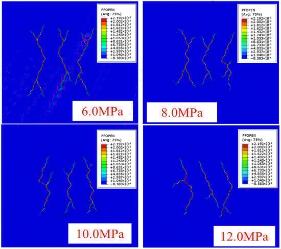 In the first set of numerical simulations (Figure 5 and Figure 6 and Table 3), the morphology of hydraulic fracture propagation was analyzed at a formation temperature of 140 °C with horizontal stress differences of 6.0 MPa, 8.0 MPa, 10.0 MPa, and 12.0 MPa, respectively. The results indicated that as the horizontal stress difference increased, the discrepancy between the propagation length of the middle fracture and that of the side fractures also increased. When the horizontal stress difference was 6.0 MPa, the three hydraulic fractures exhibited nearly free propagation, and the stress shadow effect exerted minimal inhibition on the middle fracture, whose propagation length was only 2.4% shorter than that of the side fractures. At 8.0 MPa, the propagation of the middle fracture was slightly constrained, with its length reduced by 8.2% relative to the side fractures [29]. When the horizontal stress difference increased to 10.0 MPa, the inhibition of the middle fracture propagation became significant, with its length reduced by 34.7% compared to the side fractures. At 12.0 MPa, the restriction on the middle fracture propagation intensified further, the stress shadow effect was enhanced, and the difference in fracture lengths increased to 51.6%.