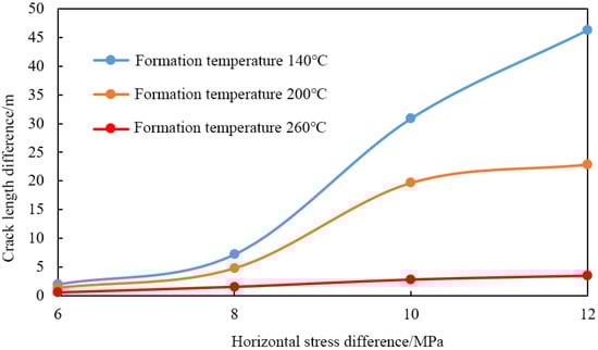 As shown in Figure 11, when the formation temperature was 140 °C, the difference in extension lengths between edge and middle fractures increased significantly once the formation pressure exceeded 8 MPa. When the horizontal stress difference reached 12 MPa, this difference reached 51.6%. Increasing the formation temperature effectively mitigated the impact of the stress shadow effect on fracture propagation. Specifically, at formation temperatures of 200 °C and 260 °C with a horizontal stress difference of 12 MPa, the difference in extension lengths between edge and middle fractures was reduced to 24.8% and 3.74%, respectively.