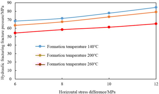 Comparison of hydraulic fracturing fracture pressure under different formation temperatures and different horizontal stress differences.