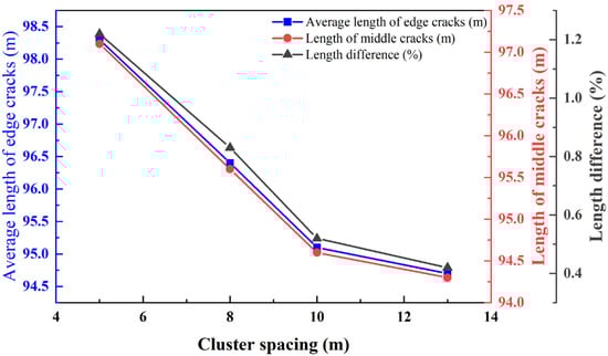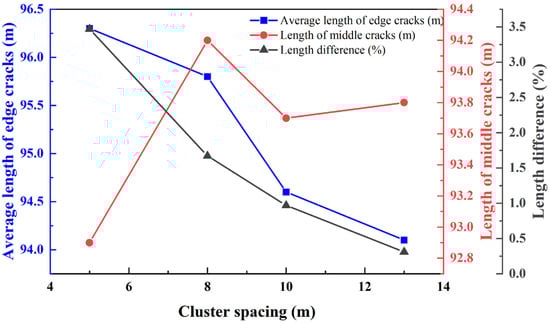 As shown in Table 7, when the cluster spacing was 5.0 m, the extension length of the edge fracture increased by 1.22% compared to the middle fracture. At a cluster spacing of 8.0 m, the extension lengths of the edge and middle fractures were nearly identical, with a length difference of only 0.83%. Further increasing the cluster spacing to 13.0 m reduced the difference between the edge and middle fractures to 0.42%. Based on these results, the optimal cluster spacing under the given conditions was determined to be approximately 5.0 m.
