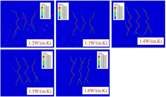 To investigate the impact of rock thermal conductivity on the dynamic propagation of multiple hydraulic fractures, the temperature of the deep shale reservoir was set to 200 °C, with a horizontal stress difference of 10.0 MPa and a cluster spacing of 4.0 m. The rock thermal conductivity was varied at 1.2 W/(m·K), 1.3 W/(m·K), 1.4 W/(m·K), 1.5 W/(m·K), and 1.6 W/(m·K). Figure 19 presents the simulation results for the propagation of multiple hydraulic fractures under these different thermal conductivity conditions.