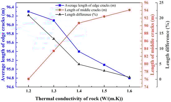 The simulation results indicated that as the thermal conductivity of the rock increased, the difference in extension length between the middle crack and the edge crack gradually decreased. At a thermal conductivity of 1.2 W/(m·K), the hydraulic fracture exhibited a pronounced internal inclusion phenomenon during propagation. This phenomenon was significantly reduced when the thermal conductivity increased to 1.3 W/(m·K). Furthermore, at a thermal conductivity of 1.5 W/(m·K), the three fractures propagated uniformly, accompanied by a substantial increase in the number of branch fractures (Figure 17 and Figure 18 and Table 8).