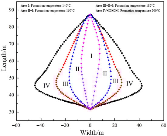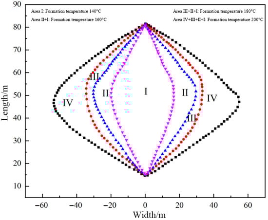 During the research, the physical properties of reservoir rocks under single-fracture expansion conditions were initially analyzed. Figure 20 and Figure 21 illustrated the variations in Young’s modulus and reservoir permeability of the rocks during hydraulic fracturing at different formation temperatures. The analysis of Young’s modulus degradation under single-fracture conditions revealed that as the formation temperature increased, the degradation area of Young’s modulus expanded significantly. Notably, when the formation temperature exceeded 180 °C (specifically reaching 200 °C), the degradation zone of Young’s modulus exhibited a marked increase. Furthermore, Figure 21 demonstrated that due to reservoir damage, the area of the permeability enhancement zone also expanded significantly.
