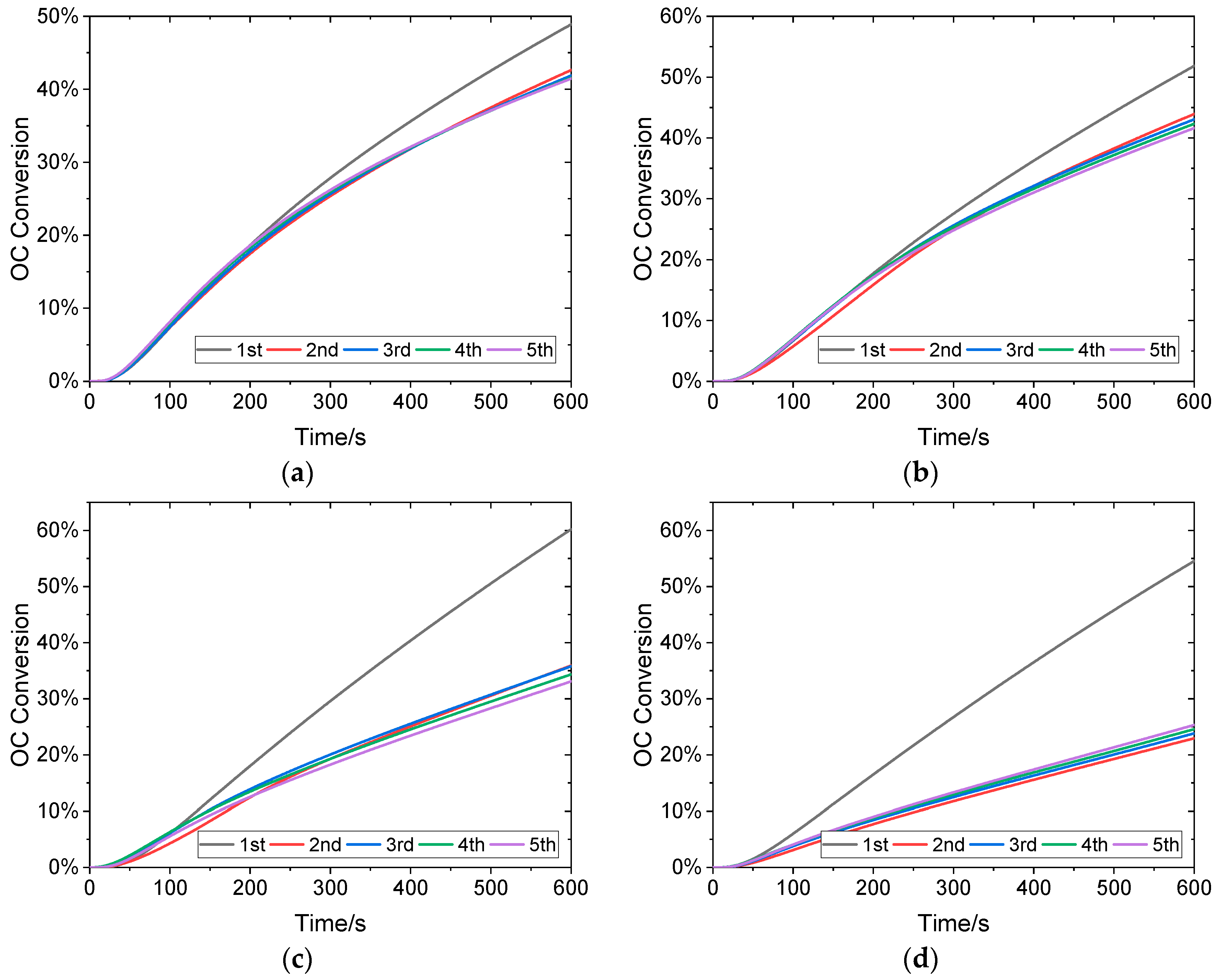 - Increasing the reaction temperature from 750 °C to 850 °C enhances the initial OC conversion, whereas operating at 900 °C instigates swift potential sintering, as indicated by a pronounced drop in CO2 yield.