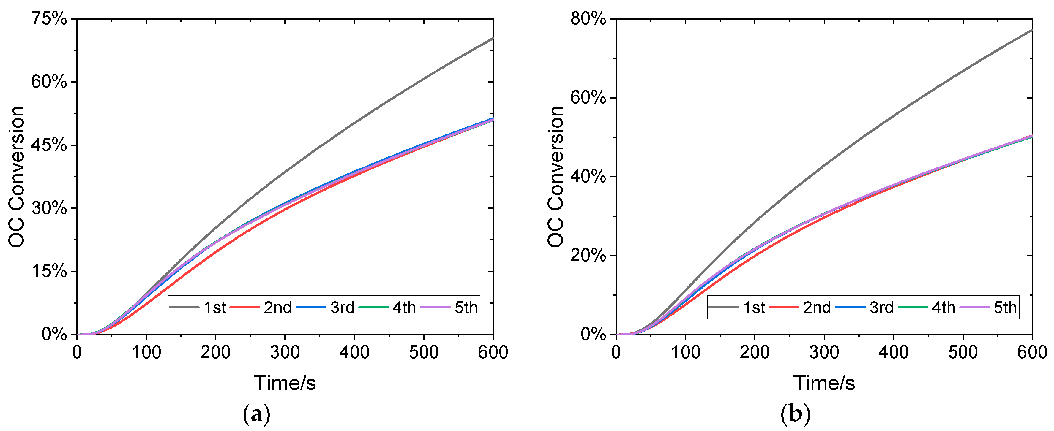 - A notable self-activation effect was noted in sintered OC during prolonged cycling at 900 °C with 20% CO, which led to a gradual increase in conversion from 32.07% to 37.33% over 15 cycles.