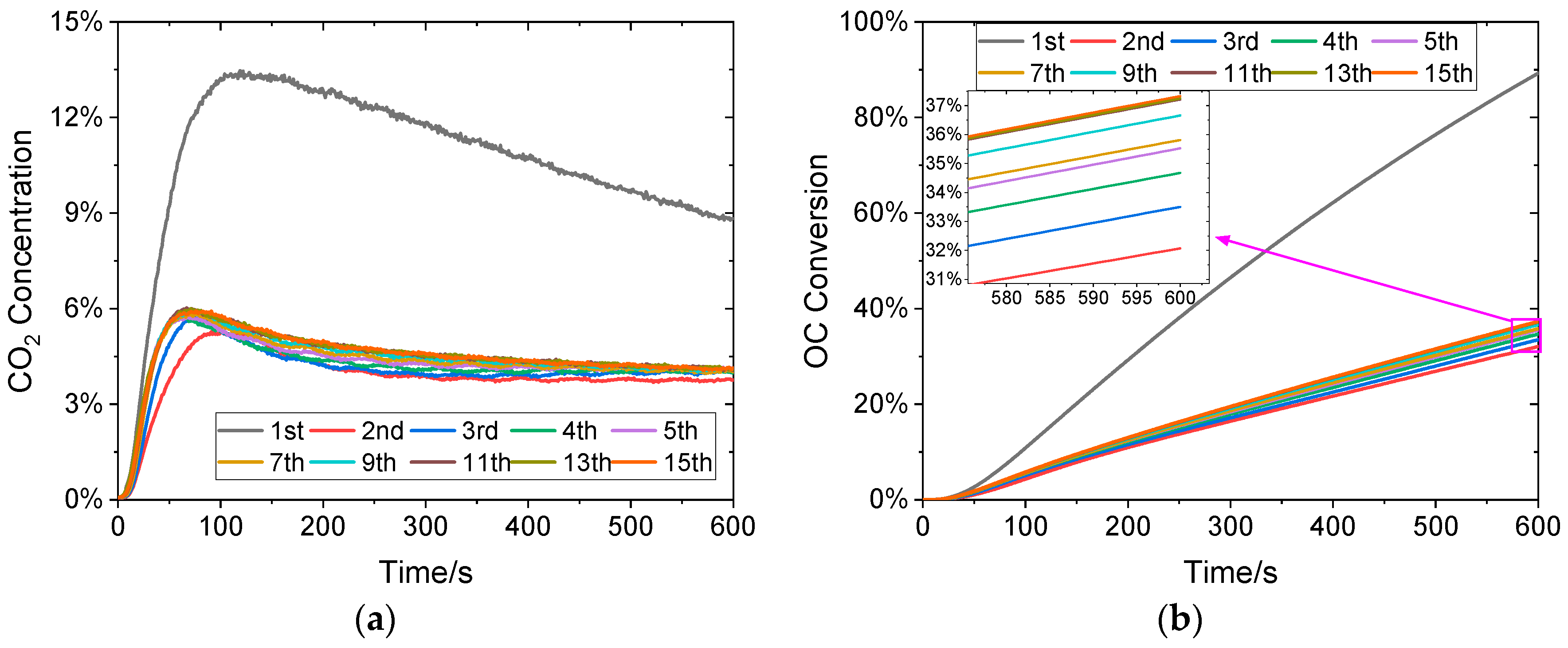 APA StyleTao, C., Liang, Q., Li, Q., He, M., Shen, X., Wang, H., Wang, M., & Wang, X. (2025). Performance Evaluation and Kinetic Analysis of an Iron Ore as Oxygen Carrier in Chemical Looping Combustion. Processes, 13(9), 2949. https://doi.org/10.3390/pr13092949