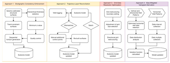 Using Middle East Oilfield A as a case study, this research addresses horizontal well structural modeling challenges through three novel methodologies: stratigraphic layer iteration for vertical consistency, virtual control point generation to constrain complex trajectories, and local grid refinement to resolve discretization conflicts. For reservoir property characterization, we propose complementary geostatistical approaches: selective exclusion of horizontal section data to mitigate sampling bias and strategic extraction of horizontal segment data for variogram derivation. This integrated framework leverages the rich geological information from horizontal wells while neutralizing spatial clustering artifacts, enabling accurate representation of reservoir architecture and providing transferable solutions for thin-bedded carbonate reservoirs globally [24,25,26,27,28]. The geological modeling workflow follows a multi-stage refinement process. This integrated approach iteratively updates the subzone model to enhance structural and stratigraphic accuracy (Figure 1).
