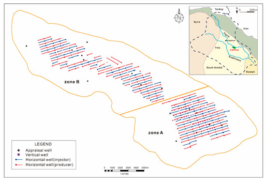 Oilfield A is situated in south-central Iraq, approximately 180 km southeast of Baghdad. Located within the passive continental margin of the northeastern Arabian Plate’s Persian Gulf Basin, the field exhibits a NW-SE trending anticlinal structure formed during the Late Cretaceous measuring 29 km × 8 km. This low-relief feature (regional dip < 2°) comprises three culminations: eastern Zone A and western Zone B (Figure 2). Development strategies differ by structural element: Zone A employs hybrid vertical–horizontal well patterns as the vertical well needs to simultaneously develop deeper oil reservoirs, while Zone B utilizes exclusively horizontal well configurations.