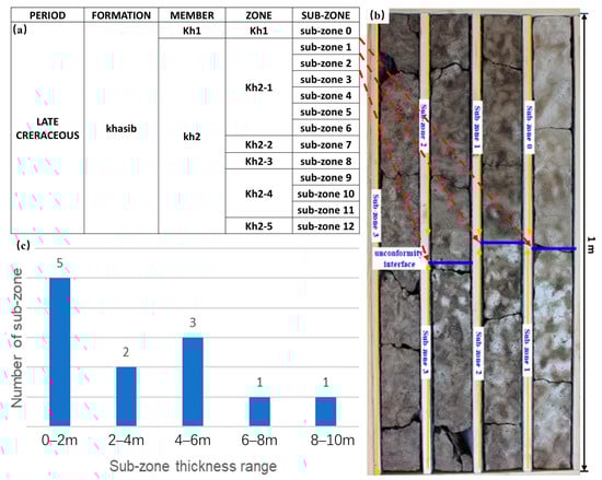Stratigraphic architecture of Khasib Formation Kh2 reservoir, Oilfield A. (a) Core photograph showing hardground-bound parasequences with subzone thickness distribution statistics; (b) Detailed subzone stratigraphy (Subzones 1–3), showing unconformities (blue lines) developed on hardgrounds, with representative core photographs of limestone from the study area; (c) Frequency distribution of subzone thicknesses with hardground tops and subzone boundaries indicated (red dotted lines).
