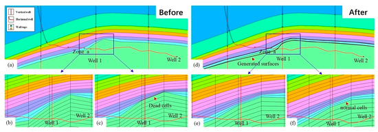 Structural model correction impact on grid integrity. (a) Pre-application: Distorted Zone A layer geometry propagating grid degeneration, culminating in zero-thickness cells (“dead grids”). (b,c) The enlarged figures showing more details of (a); (d) Post-application: Optimized structural framework conforming to seismically derived surface (black line), with geometrically regular grid cells throughout well and adjacent regions. (e,f) The enlarged figures showing more details of (d). Different colors represent different subzones in the structural model.