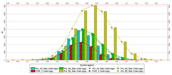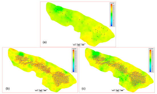 The extracted horizontal data model (Figure 10c) yields porosity values aligning with vertical well simulations (Figure 11c), while preserving the horizontal wells’ heterogeneity characterization. This approach better reflects actual reservoir property distributions by maintaining heterogeneity representation without clustering artifacts.