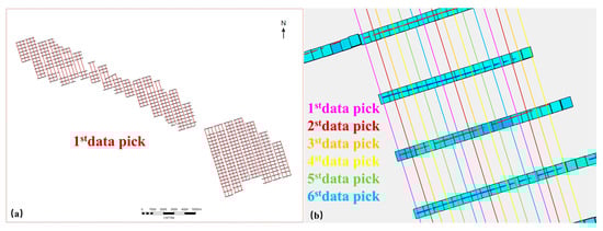 To maximize data utility while minimizing uncertainty, strategic subsampling is implemented. Horizontal well trajectories are discretized into regularly spaced pseudo-vertical control points, achieving three objectives: (1) optimized spatial distribution uniformity, (2) preservation of lateral heterogeneity information, and (3) systematic repetition of sampling intervals. As illustrated in Figure 9, this workflow initiates by defining drainage-aligned sampling lines parallel to dominant well azimuths, spaced at characteristic horizontal well spacing intervals. Intersections between sampling lines and well trajectories generate initial control points, with spatial uniformity enforced through iterative grid-shifting. Each iteration shifts sampling lines to adjacent grid positions until full areal coverage is achieved, ensuring non-redundant point selection across cycles. Composite variograms derived from multiple realizations undergo arithmetic averaging to produce a final spatial continuity model representative of reservoir heterogeneity.
