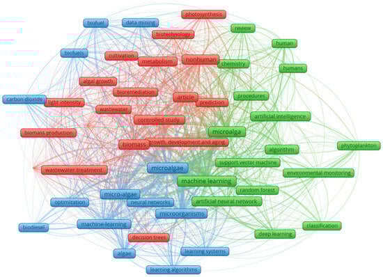 The network map generation was based on co-occurrence, with the counting method set to full counting and the unit of analysis defined as all keywords. A minimum occurrence threshold of 12 was applied out of a total of 2975 keywords identified. After data refinement, 47 keywords met the threshold and were included in the final network map, shown in Figure 2. This network map shows the distributions of all the keywords appearing in the selected publications, and the connections established around them. As can be observed, 3 clusters appear, each identified by a color. The red, green, and blue clusters revolve around the keywords “biomass”, “machine learning”, and “microalgae”, respectively. The green cluster is influenced by the large number of publications focused on the development of data-driven models, while the red and blue clusters are more interested in the analysis of processes involving microalgae for distinct applications: wastewater treatment and biofuel production, respectively. The content of some of these articles is discussed in the following sections.